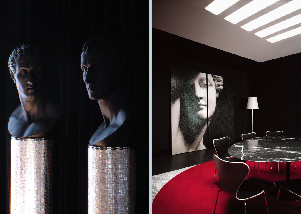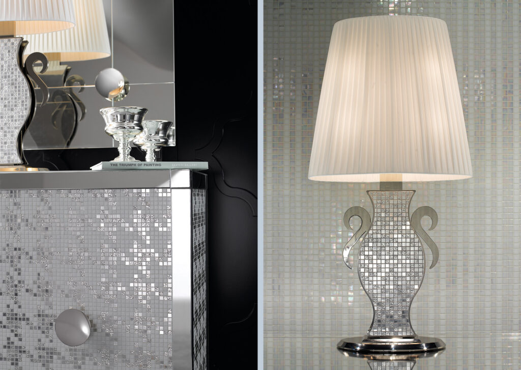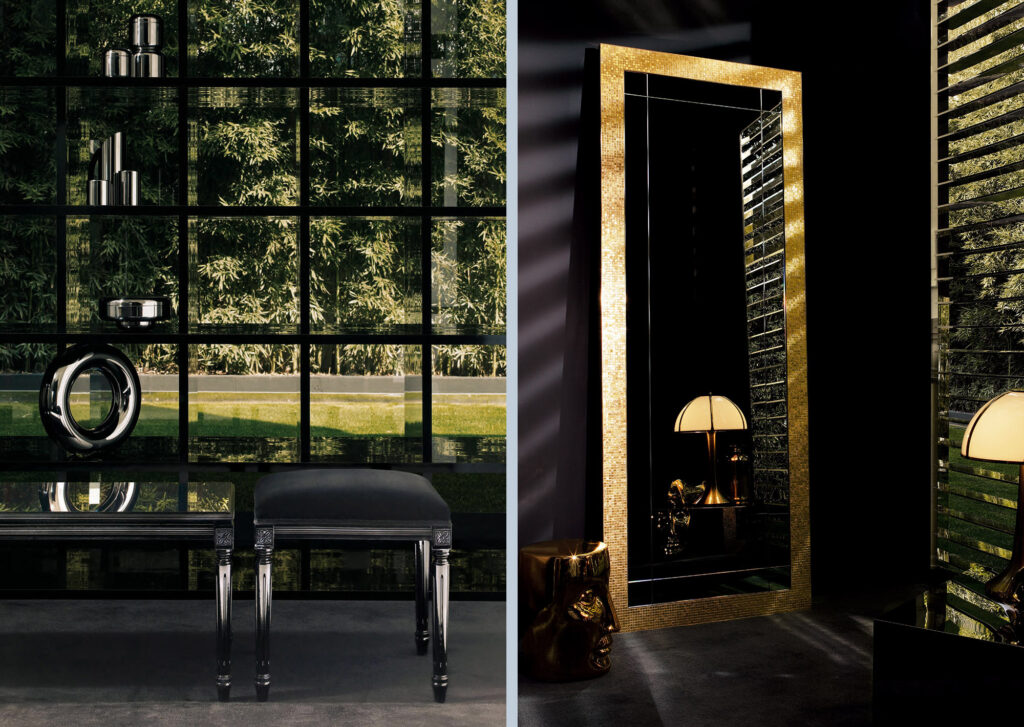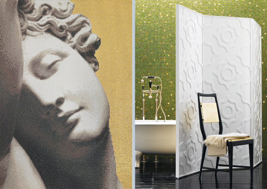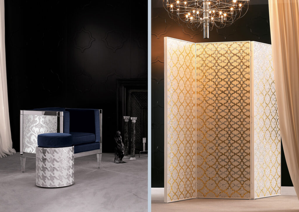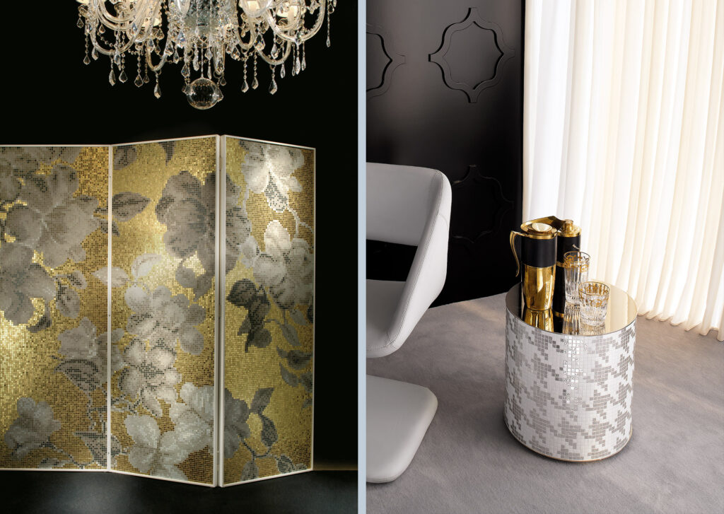 La collezione Bisazza Home propone una serie di mobili e oggetti rivestiti in mosaico immaginato come una carta decorativa, una pergamena o un tessuto prezioso, traendo ispirazione dall’opera di Piero Fornasetti e di Gio Ponti, ma anche dall’America anni Quaranta o dal gusto francese di Jean-Michel Frank e André Arbus.
