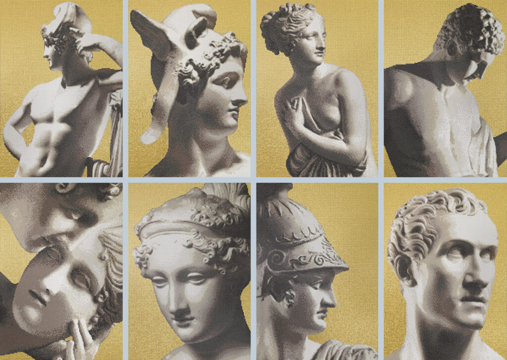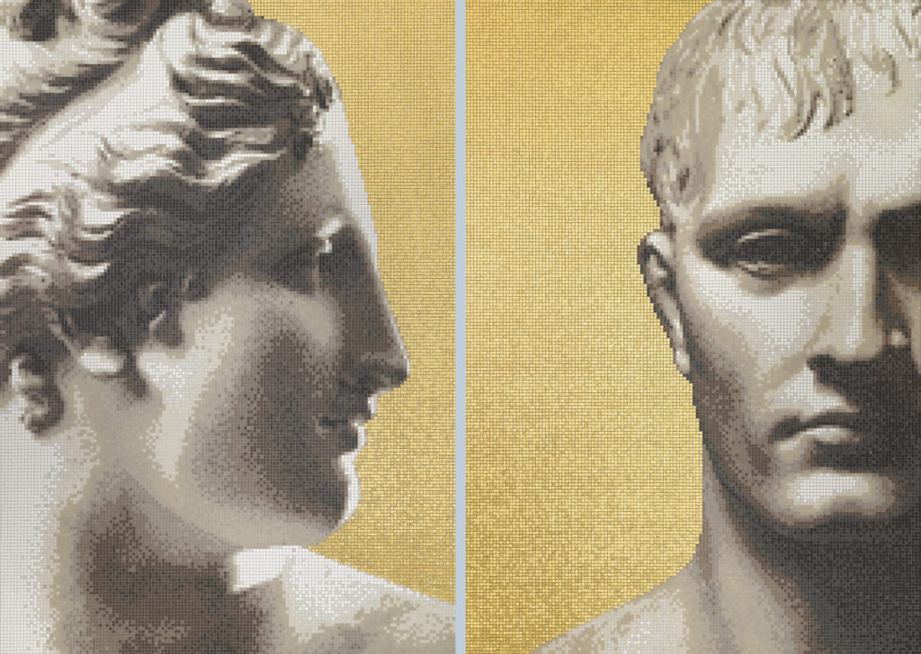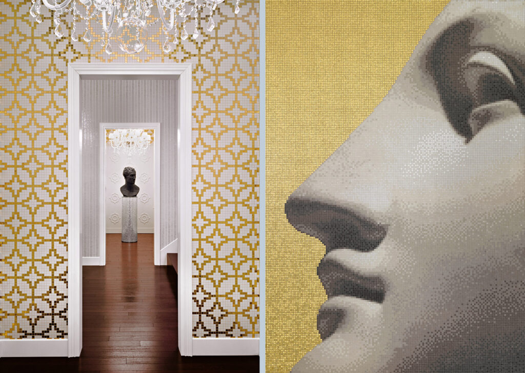 I pannelli in mosaico attingono dall’opera di Antonio Canova, Jacopo da Vignola e dall’antica tradizione della Toile de jouy.