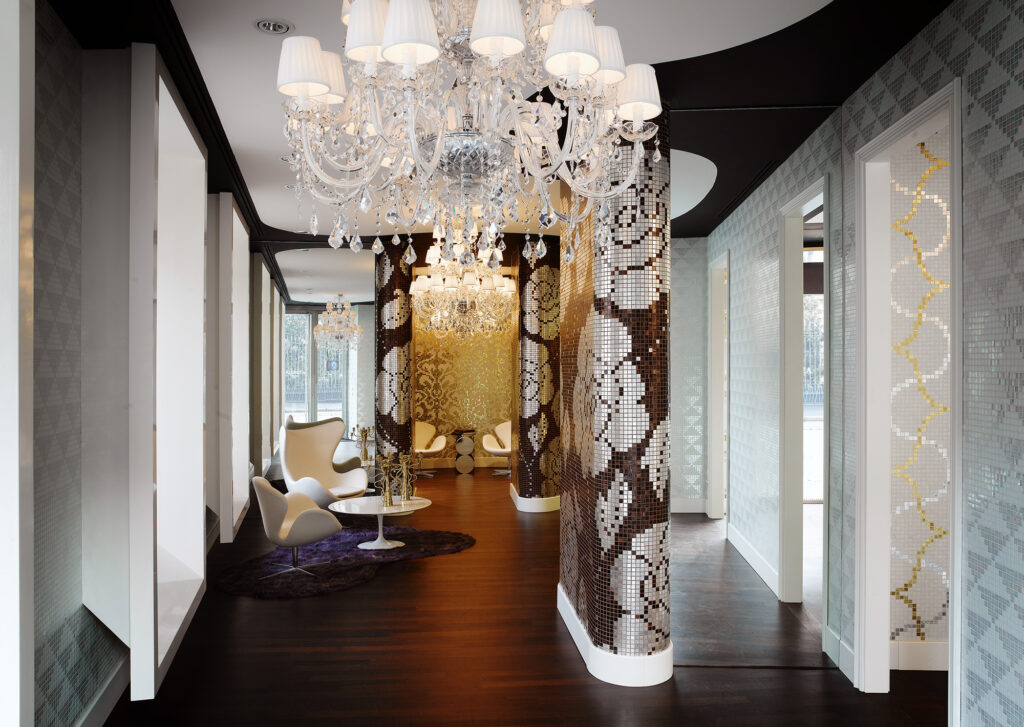 La sequenza casuale degli ambienti dello showroom di Milano trova nell’asse punteggiato dei grandi lampadari l’unico elemento regolatore e ordinatore delle nuove stanze dimensionate e conformate in funzione della loro nuova destinazione d’uso. I decori delle pareti si susseguono secondo un ordine cromatico legato alla luce naturale delle vetrate o alla luce artificiale.