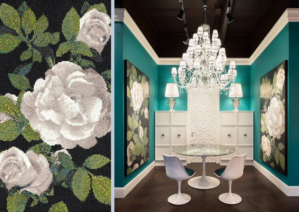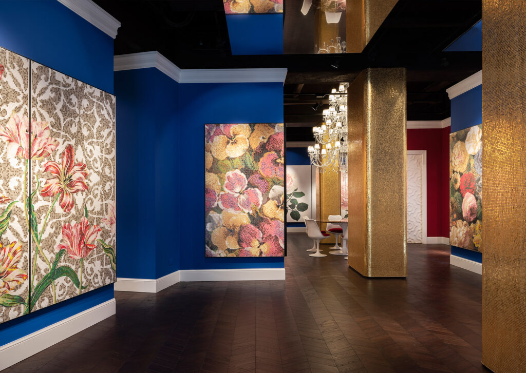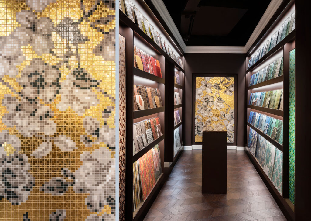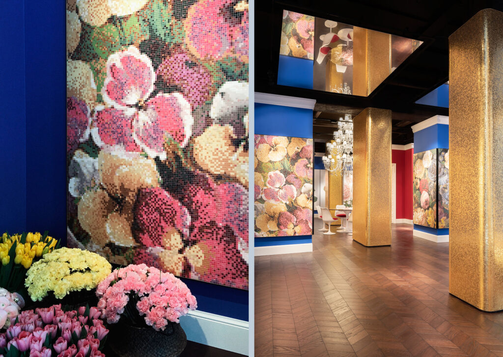 All’interno del nuovo Flagship Store si manifesta un inaspettato e rigoglioso giardino dove i fiori sono reinterpretati in mosaico: nuovi decori disegnati da Carlo Dal Bianco che parlano di colore, di bellezza, di primavera, ispirati all’armonia e all’allure dei giardini italiani e francesi.