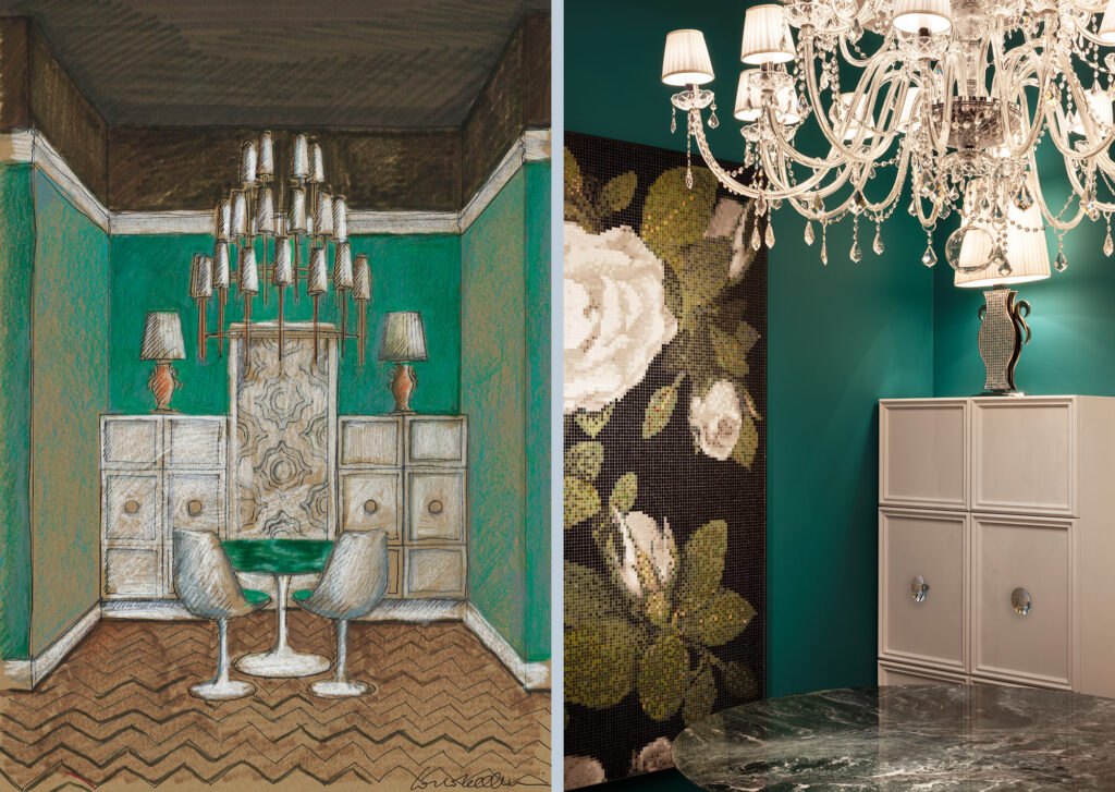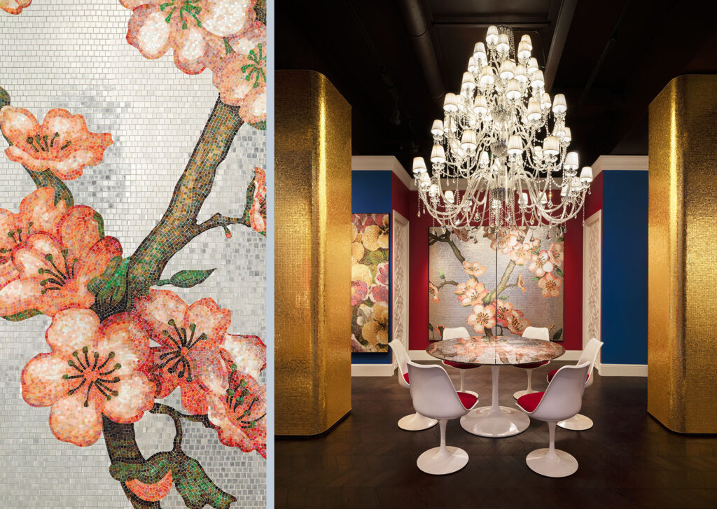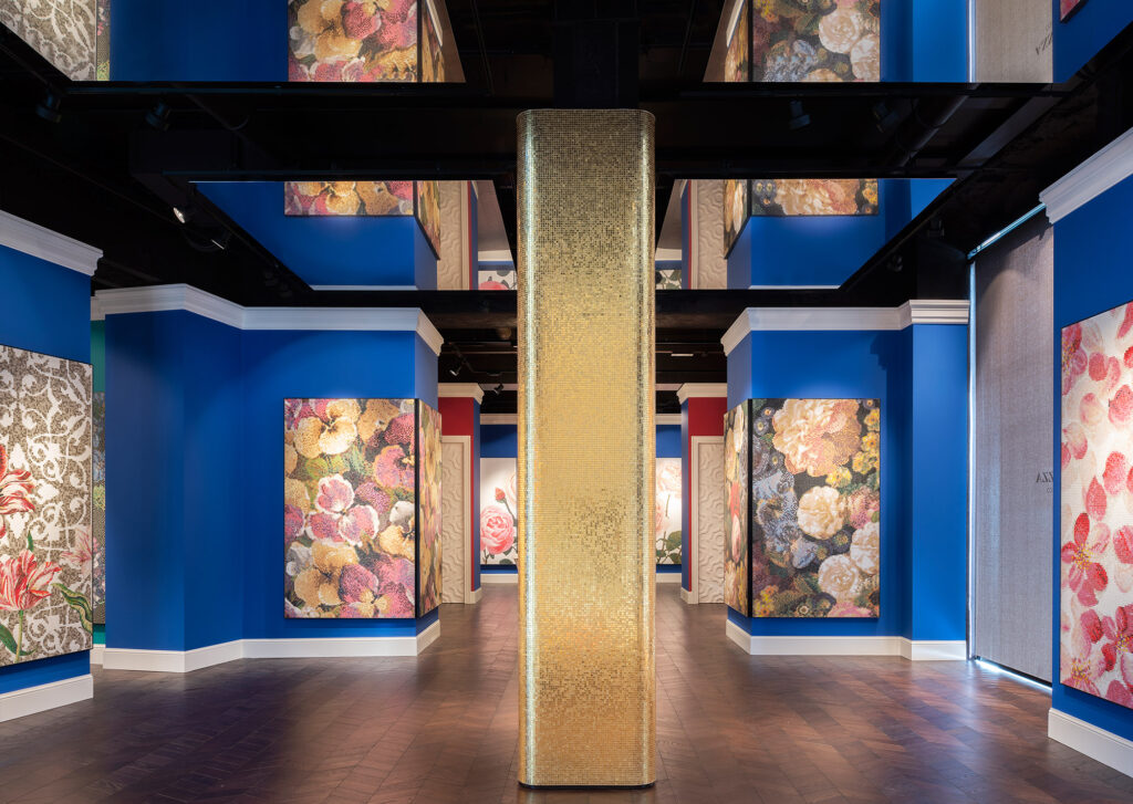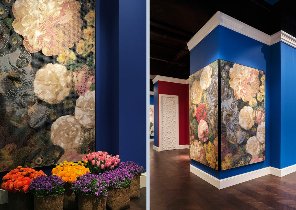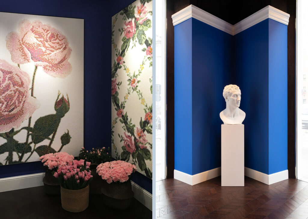 All’interno del nuovo Flagship Store si manifesta un inaspettato e rigoglioso giardino dove i fiori sono reinterpretati in mosaico: nuovi decori disegnati da Carlo Dal Bianco che parlano di colore, di bellezza, di primavera, ispirati all’armonia e all’allure dei giardini italiani e francesi.