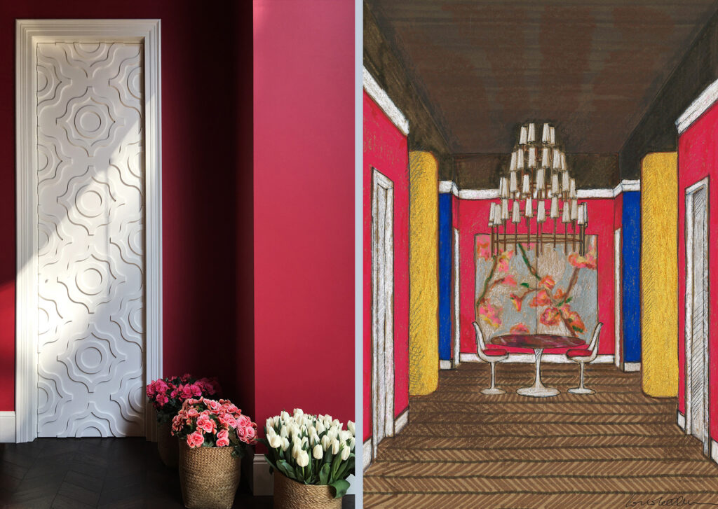 I colori alle pareti influenzano la scelta dei tessili e dei preziosi piani in marmo, illuminati da grandi chandelier su disegno. Quattro grandi specchi sospesi, posti nella sala centrale, raddoppiano la già importante altezza degli ambienti, creando un’inaspettata prospettiva verticale. Una sorta di macchina barocca.