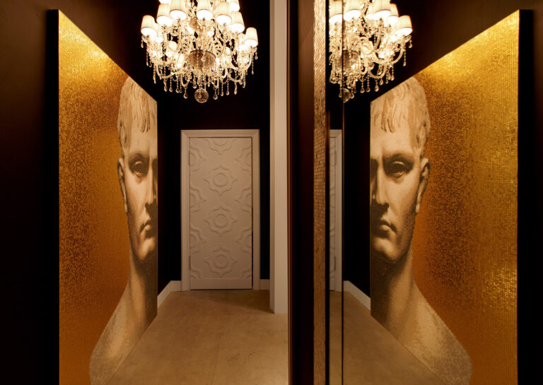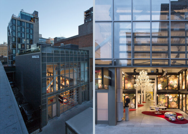 The New York showroom is built in the heart of Chelsea, inside a building of about 400 square metres. The main façade opens wide towards the street, thus creating continuity between exterior and interior. The interior is configured as a single double-height volume, the walls of which are covered with overlapping layers of mosaic panels, at the centre of which is an imposing chandelier Marie Antoinette. On the top floor, the large upper terrace offers a privileged view directly onto the scenic High Line route.