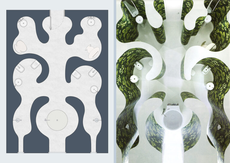 Un puro esercizio di “stile libero”, ironico, tecnicamente complesso. Seguendo le linee sinuose delle pareti, gli spazi si aprono e si chiudono, si allontanano e si ritrovano, disegnando di volta in volta ambienti privati o comuni, pensati per un modello di convivenza capace di garantire libertà e nello stesso tempo intimità e benessere. Il tutto pensato anche all’interno di una grande abitazione privata.