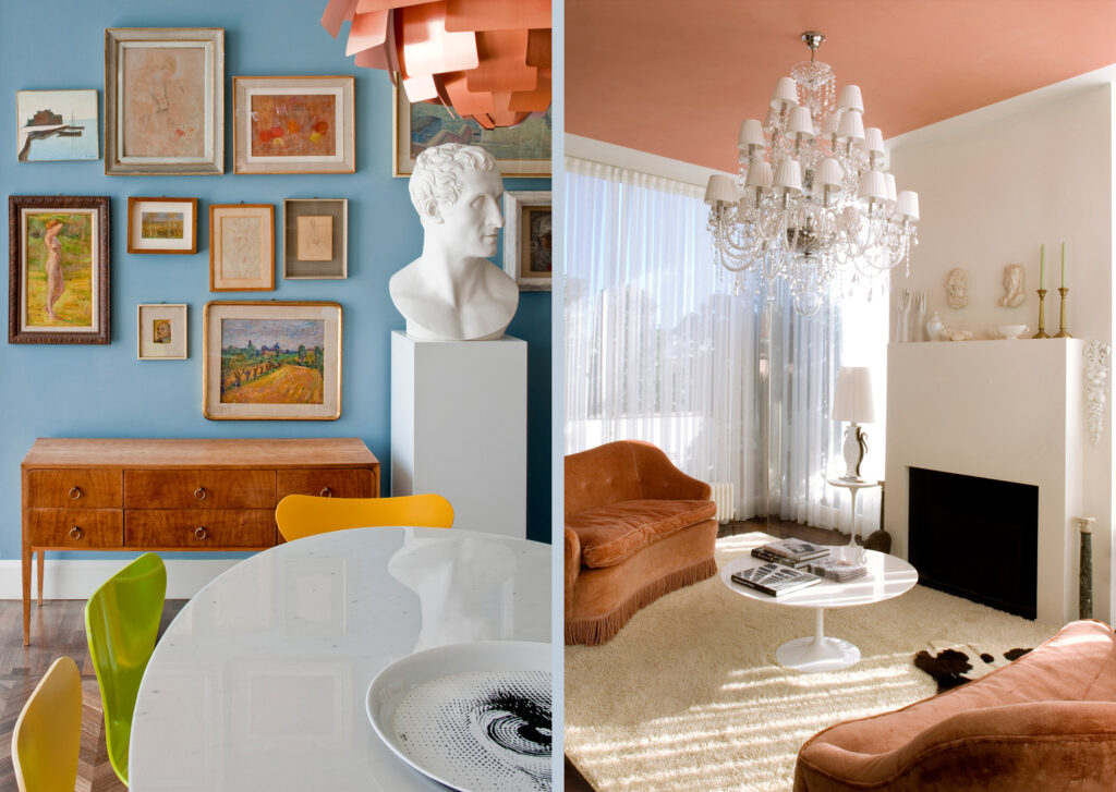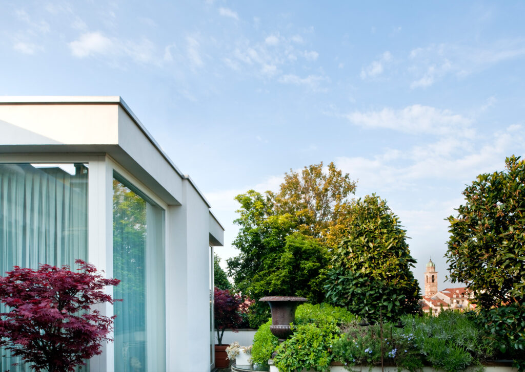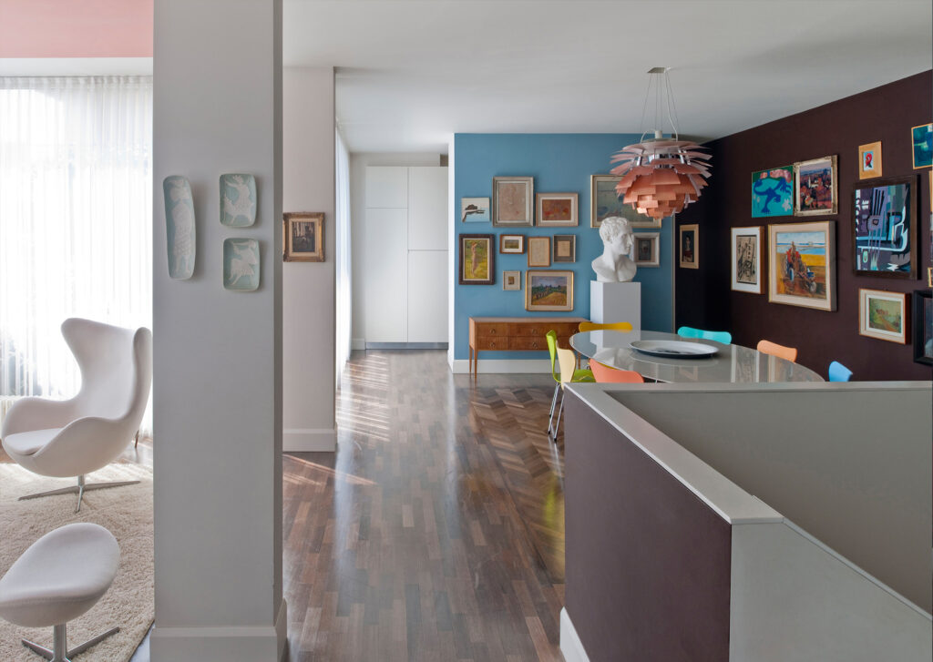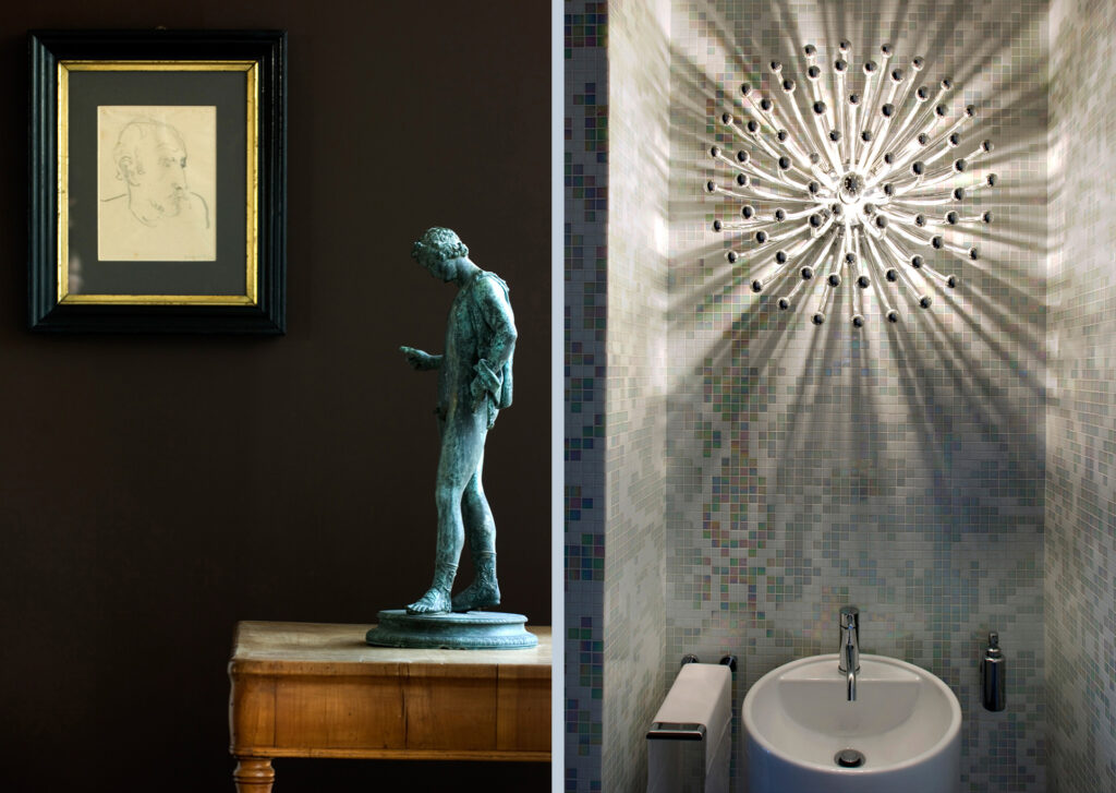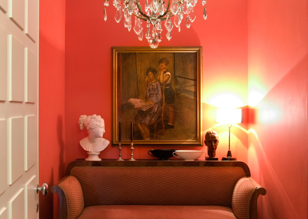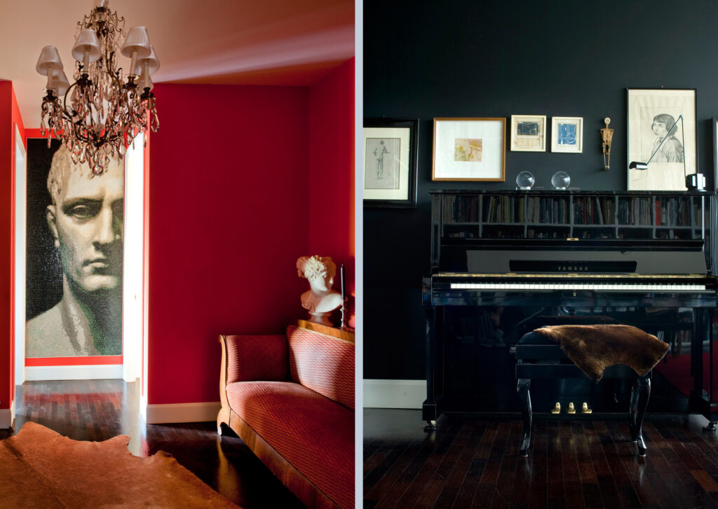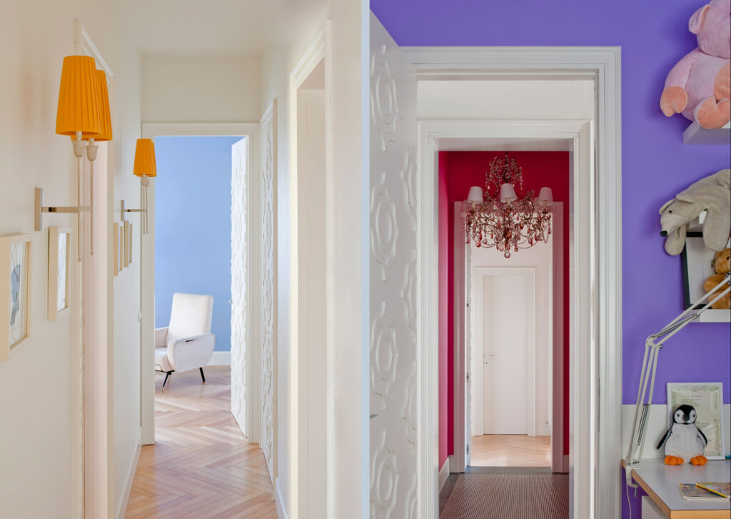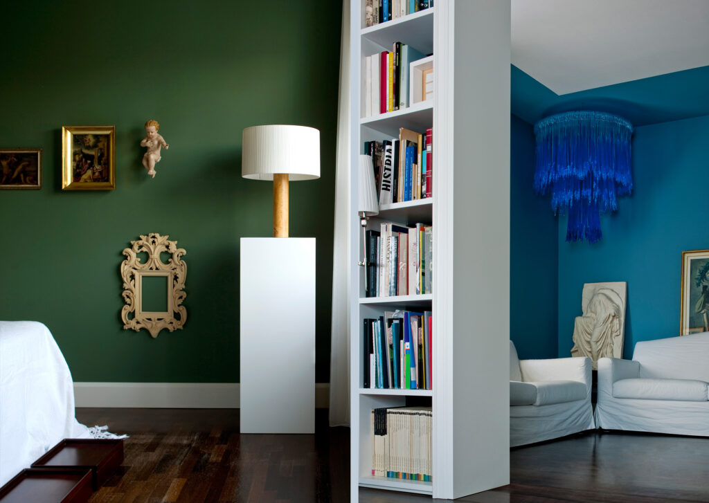 I colori intensi delle pareti sono stati selezionati per valorizzare i toni dei dipinti, in contrapposizione alla luce naturale delle ampie superfici vetrate. Ad ogni ambito della casa è assegnato un colore diverso per dialogare con il modus habitandi delle singole stanze. Il rosso dell’ingresso trasmette energia ed accoglienza, il nero della biblioteca invita alla concentrazione e alla lettura mentre il verde della camera padronale rimanda alla quiete e al riposo.
