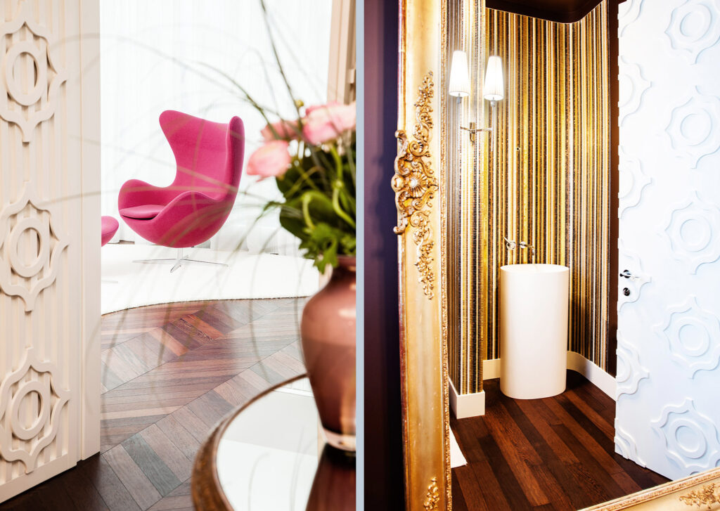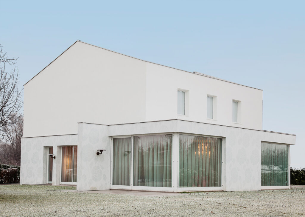 L’obiettivo del progetto era quello di riuscire a mediare la matrice fortemente tecnologica della casa passiva a sfruttamento geotermico, realizzata con i materiali più innovativi e biocompatibili, con l’immagine di una casa classica e tradizionale che esprimesse il gusto e la personalità della committenza. Il risultato è la sintesi tra il rigore minimale degli esterni ed il gusto decorativo degli interni, messi in relazione da un decoro floreale in mosaico bianco che, dall’interno si sviluppa lungo le facciate esterne, contrapponendosi così all’austerità puramente funzionale.