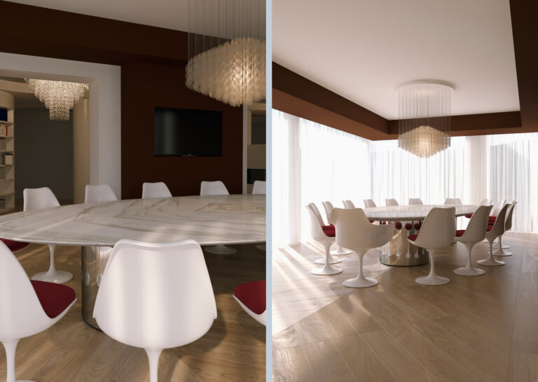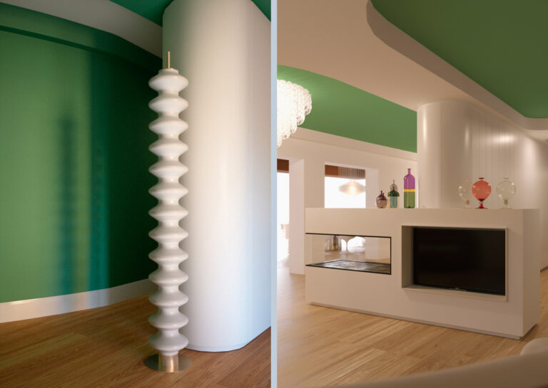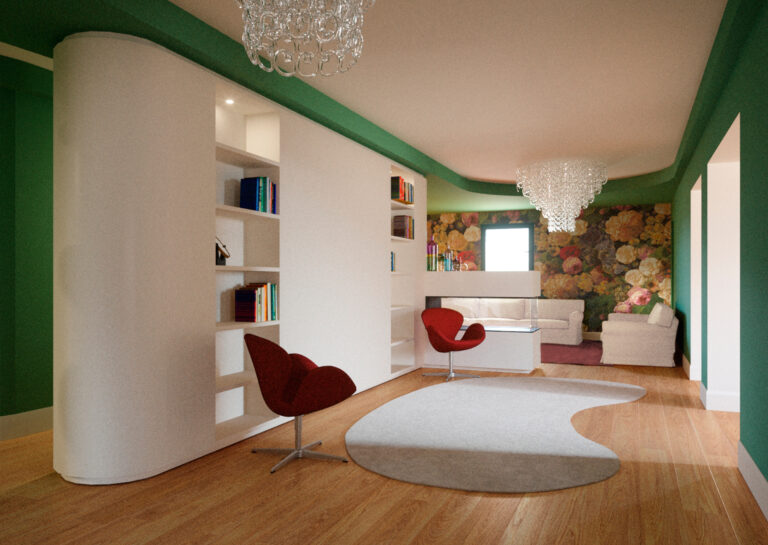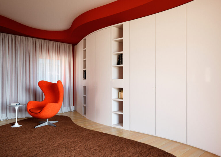Una casa che rispecchia il gusto dei clienti con colori audaci ed intensi che identificano i vari ambienti dell’abitazione. Ad esaltare l’amore per gli anni ’60, una selezione di arredi di Panton, Saarinen e Jacobsen. Anche le linee di soffitti, tappeti e arredi su misura si ammorbidiscono e diventano curve per creare un ambiente morbido ed accogliente. Per consentire di avere superfici dove poter ospitare le opere d’arte dei padroni di casa, le boiserie e i mobili sono realizzati in legno laccato bianco smorzando le tonalità accese. Il grande tavolo da pranzo, anch’esso curvilineo, consente di ospitare la numerosa famiglia e di creare un’interazione diretta con gli ambienti circostanti del living.