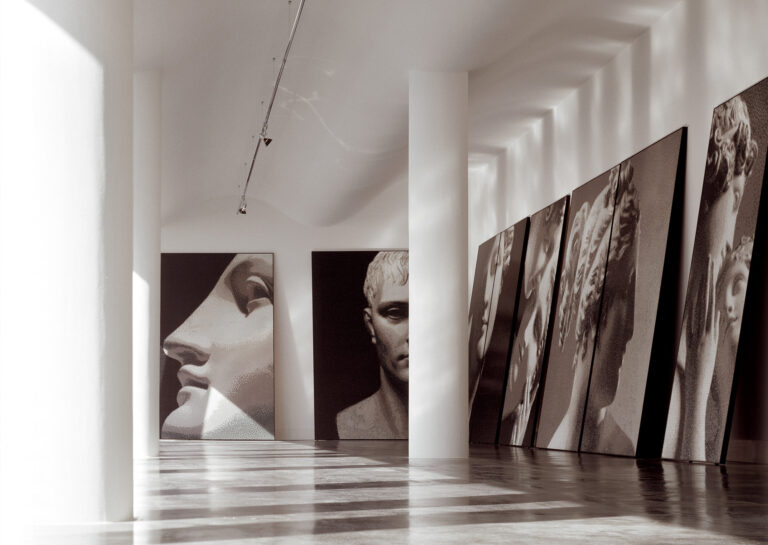 I pannelli in mosaico attingono dall’opera di Antonio Canova, Jacopo da Vignola e dall’antica tradizione della Toile de jouy.