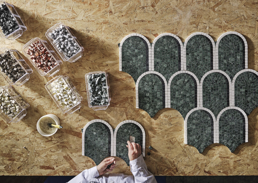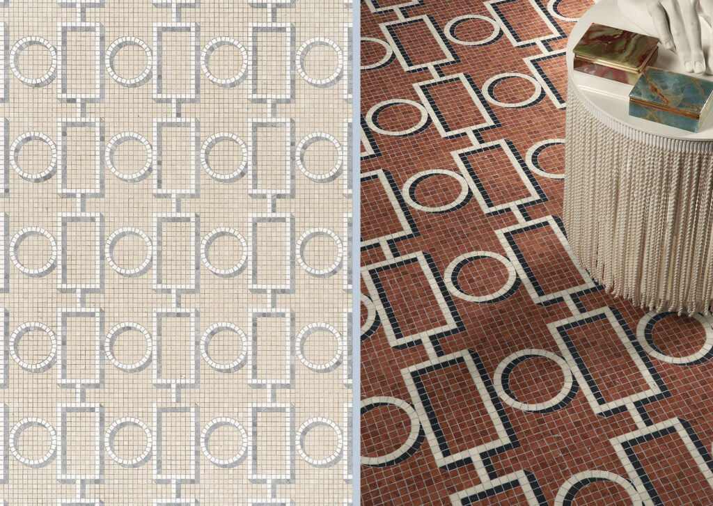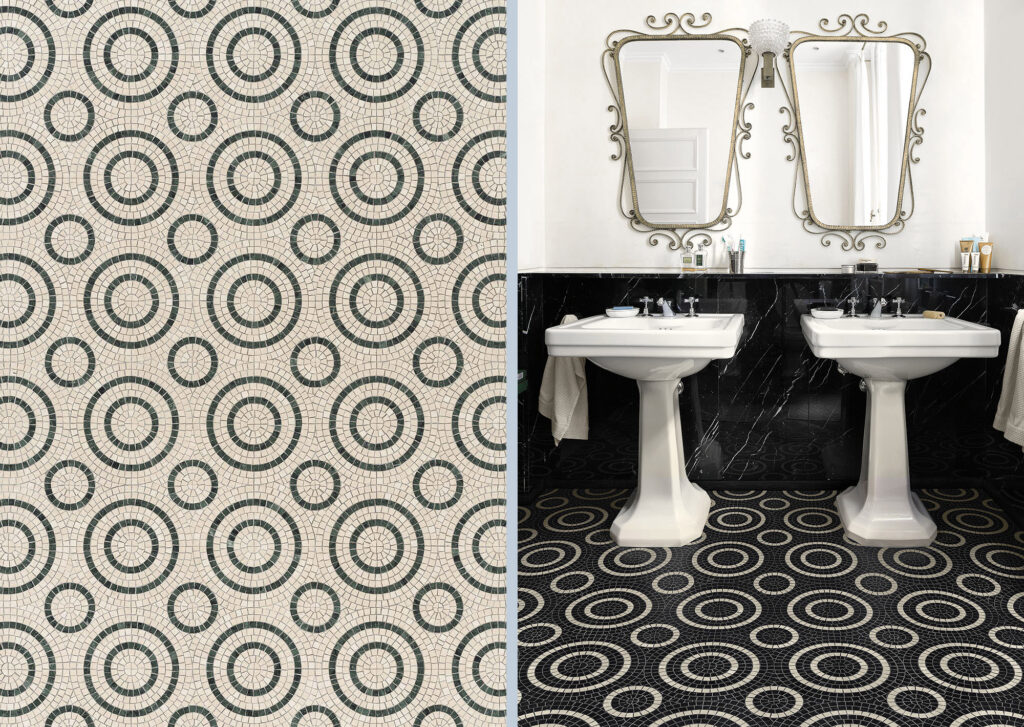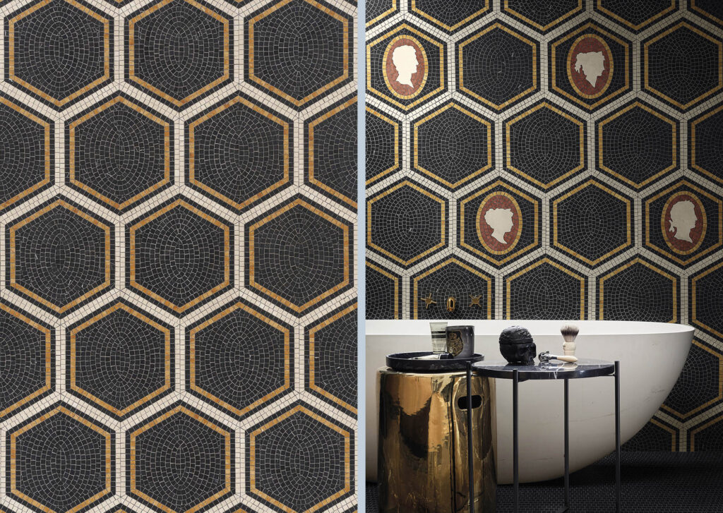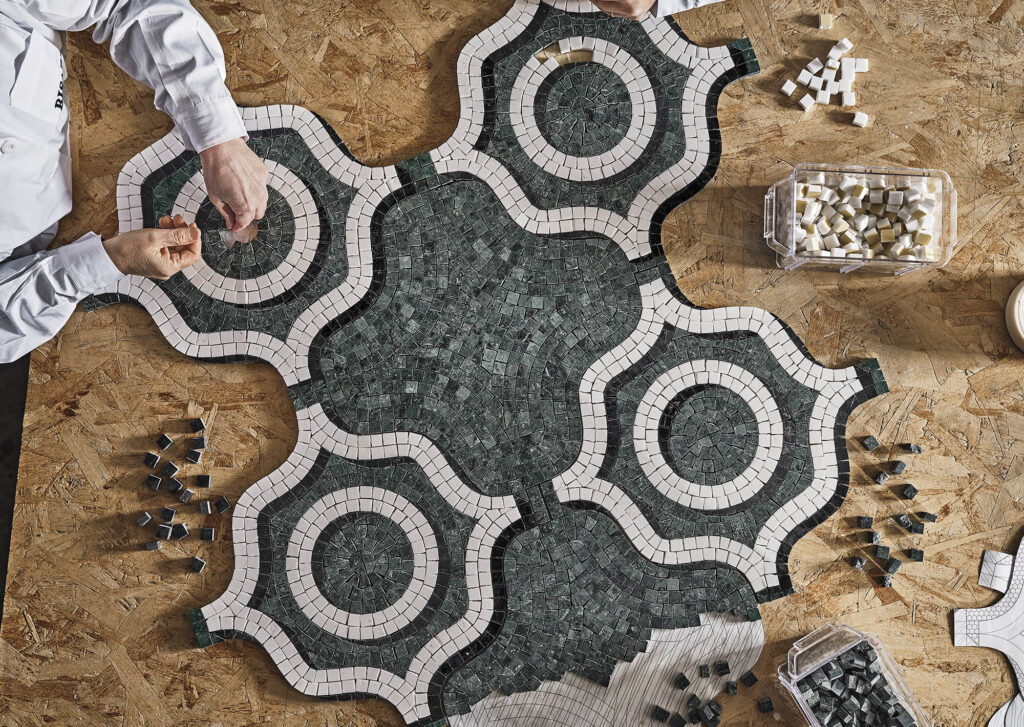 Marmosaico, una collezione di dieci decori in mosaico di marmo disegnata per Bisazza che reinterpreta la tradizione dei più interessanti pavimenti milanesi rivisitando le forme del passato con nuovi linguaggi. Una rilettura che trae spunto dalle portinerie e dagli androni dei palazzi e delle ville del Novecento Milanese.