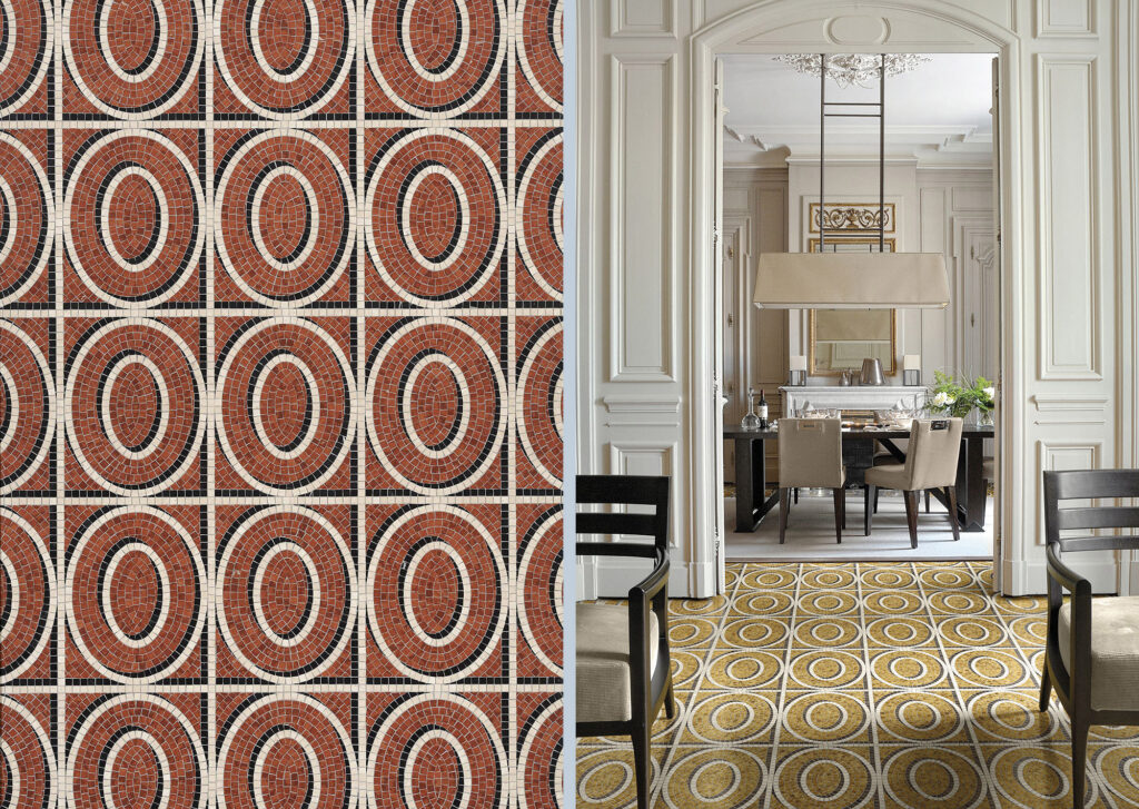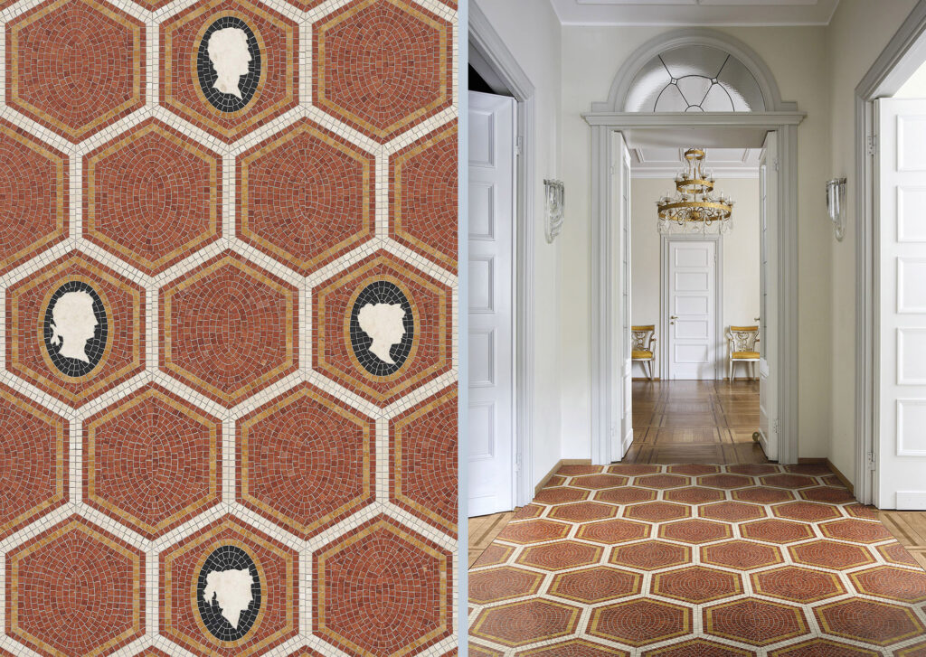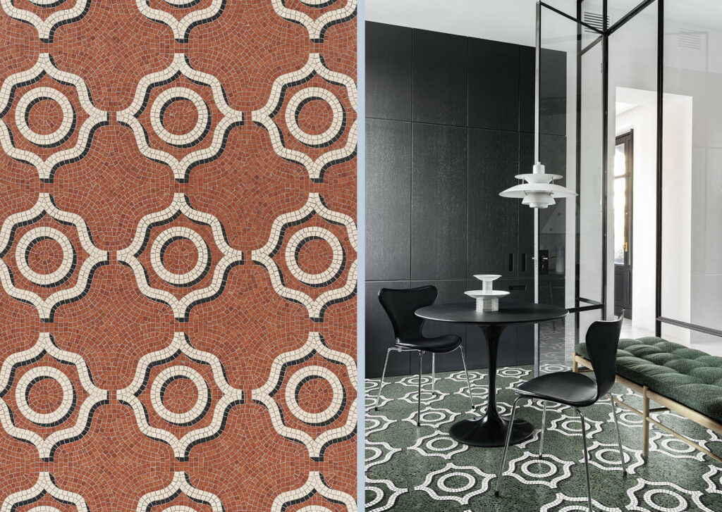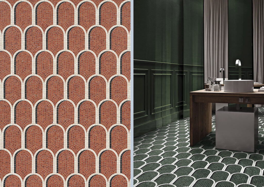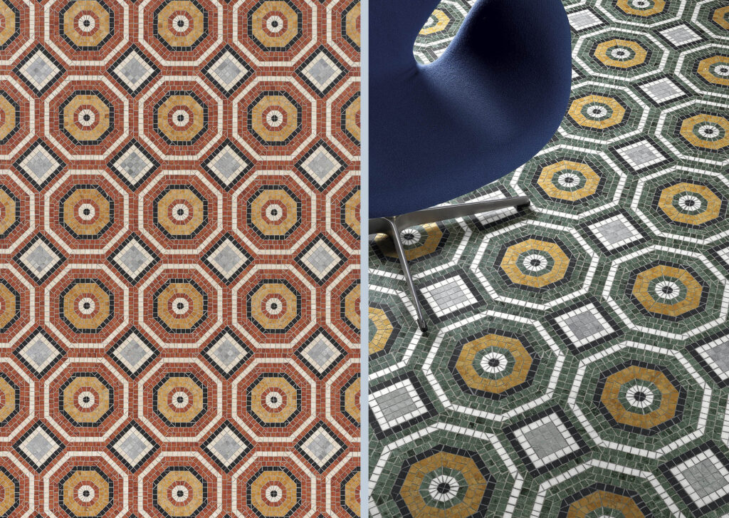 Marmosaico, una collezione di dieci decori in mosaico di marmo disegnata per Bisazza che reinterpreta la tradizione dei più interessanti pavimenti milanesi rivisitando le forme del passato con nuovi linguaggi. Una rilettura che trae spunto dalle portinerie e dagli androni dei palazzi e delle ville del Novecento Milanese.