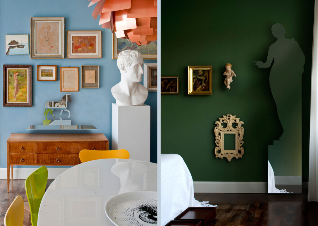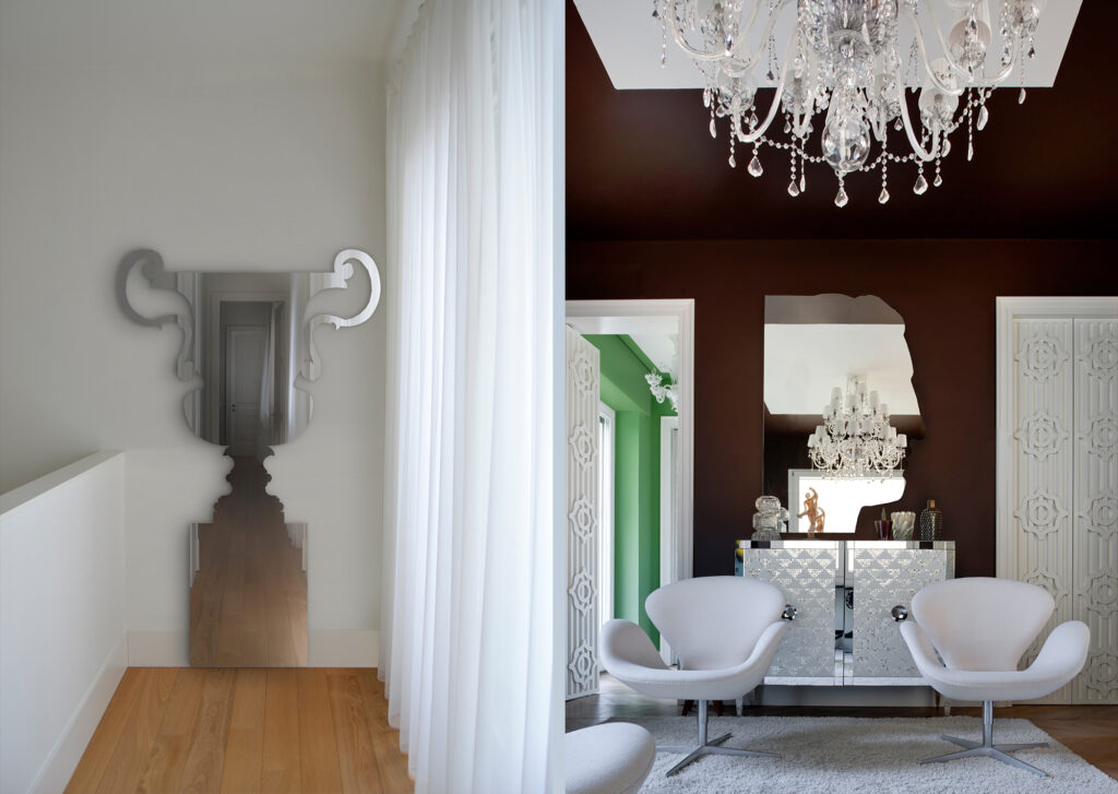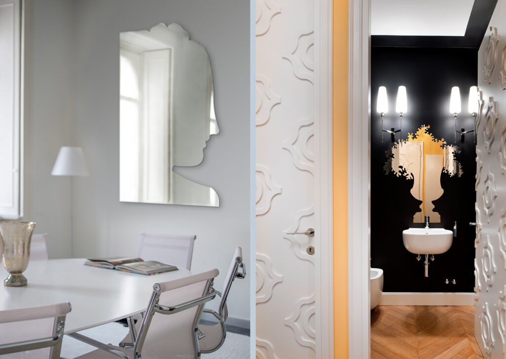 Il progetto nasce dall’unione tra fragilità dello specchio e resistenza dell’acciaio. Figure che parlano dell’immagine e della loro duplicità. Doppio è il loro apparire, come oggetti puramente decorativi e come specchi con la pratica funzione di riflettere. Il progetto indaga il tema della riflessione come immagine ed ombra di noi stessi. Tutto ha una duplice natura, come la filosofia orientale considera un’unica essenza formata da Yang e Yin; siamo contemporaneamente maschi e femmine, luce e oscurità, terra e cielo. Gli oggetti sono creati da lastre di acciaio, simbolo di durezza e inalterabilità, trattato come un fragile specchio di vetro, ritagliando in parte il profilo con morbidezza. Le figure si ispirano al tema del giardino e del frammento.