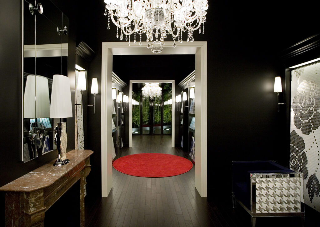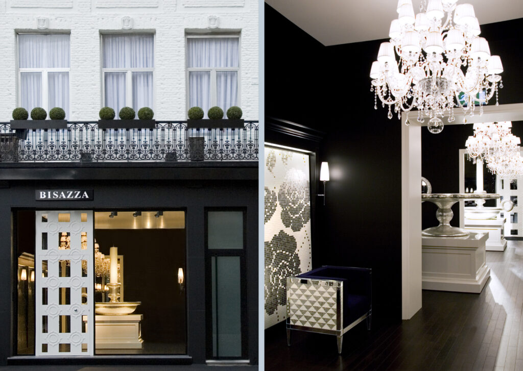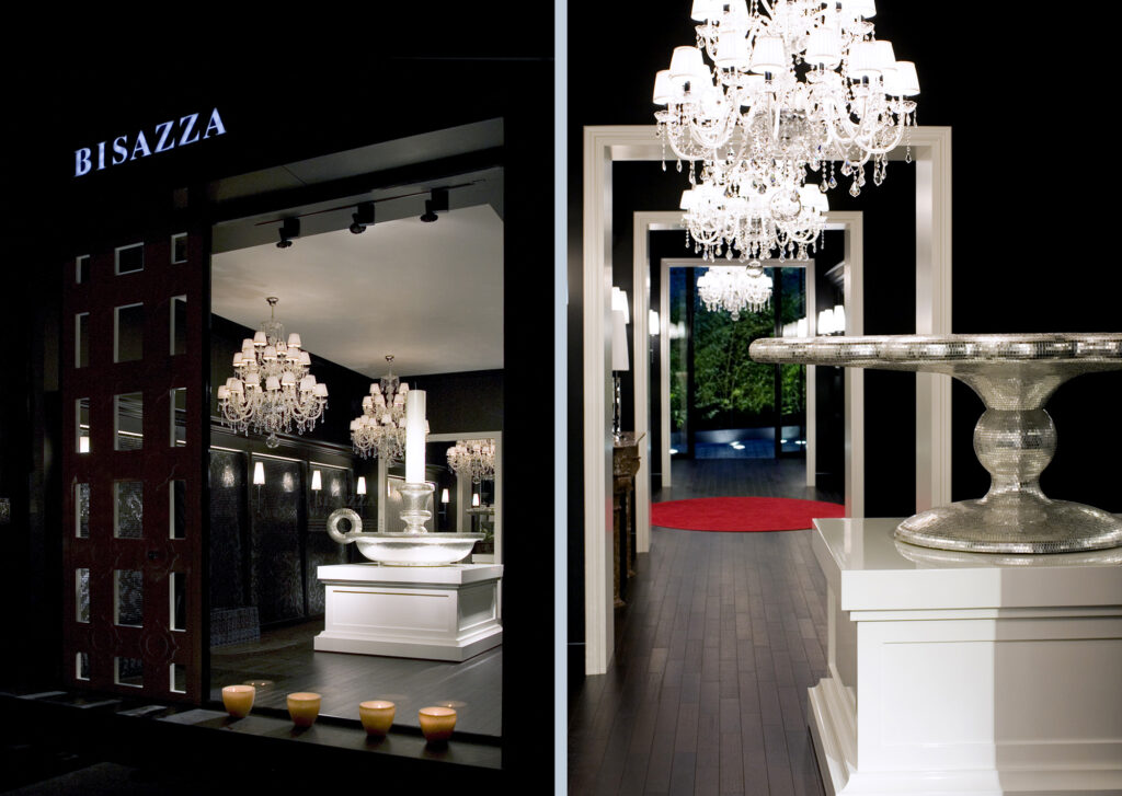 La vetrina mostra dall’esterno la successione ordinata degli ambienti della showroom. Una dopo l’altra si susseguono le stanze della casa ritmate dall’infilata dei portali bianchi e dei grandi chandeliers “Marie Antoinette” per Bisazza Home.